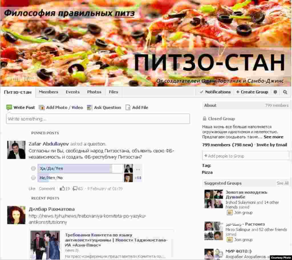 Баъд аз даъвати Гавҳар Шарофова, раиси Кумитаи забон ва истилоҳоти Тоҷикистон дар бораи Pizza-ро Питсо тарҷума кардан дар Фейсбук бо номи Питсо-стан гурӯҳе ташкил шуд. Дар ин саҳифа акси чанд шиору навиштаи пурғалат аз кӯчаву хиёбонҳои Тоҷикистон низ нашр шудааст.