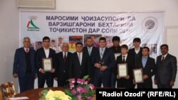 Баъдан даҳ варзишгари беҳтарини Тоҷикистон дар соли 2014, ки онҳоро Ассотсиатсияи журналистони риштаи варзиши Тоҷикистон (АЖРВТ) бар асоси назархоҳии хабарнигорони соҳа муайян кардааст, бо ҷоизаю дипломҳои АЖРВТ ва мукофоти молии Кумитаи миллии олимпии кишвар сарфароз шуданд.