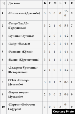 Ба ин тартиб, баъди натиҷагирии се давр дар ҷадвали мусобиқа “Истиқлол” бо 9 имтиёз пешсаф аст. “Регар-ТадАЗ” бо 7 имиёз дар зинаи дуюм қарор дорад.“Хуҷанд” ва“Хайр” 6-имтиёзӣ ба даст овардаанд. Бо дарназардошти таносуби беҳтари тӯбҳо “Хуҷанд” дар зинаи сеюм ва “Хайр” дар зинаи чорум чорум ҷойгир шудаанд.