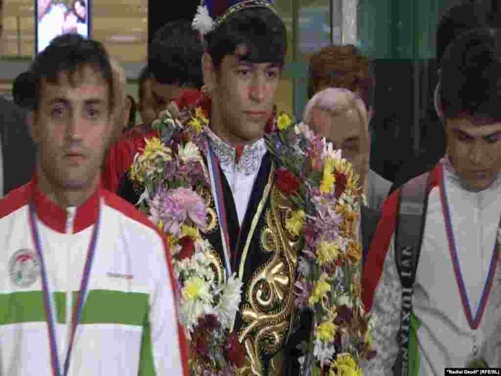Фурудгоҳи байналмилалии Душанбе шаби 14 ноябр ба базмгоҳе монанд буд. Садои карнаю сурнай, парчаму овезаҳои зиёд бо акси паҳлавонони тоҷик Саймумин Раҳимов ва Беҳрӯз Хоҷазода саҳни Фурудгоҳро пур карда буд.