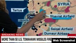 Тибқи иттилои хабаргузории CNN, ҳамлаи мушакии Амрико аз ду киштии ҷангии ин кишвар дар баҳри Миёназамин анҷом шуда ва дар ин ҳамла 50 мушак ба сӯи ин пойгоҳи низомии нерӯҳои Сурия партоб шудааст.